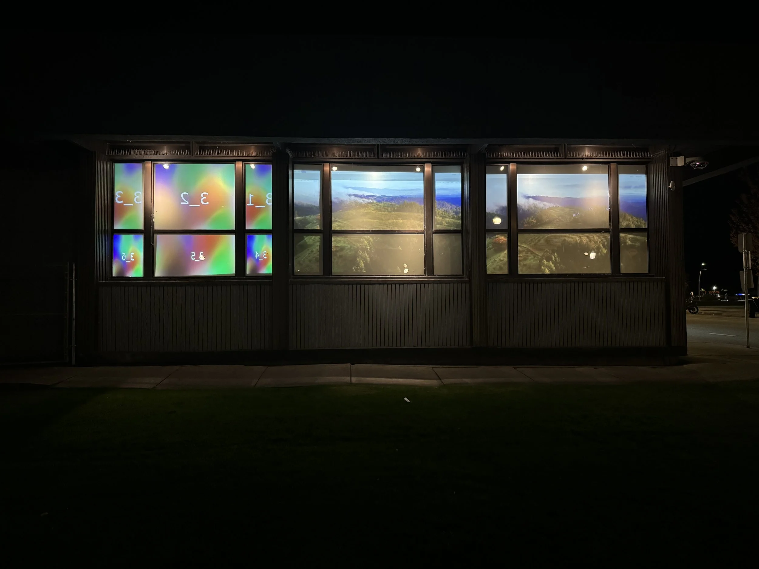 The exhibition consists of three elements viewed together: the gobo lights, the audio installation, and the three-channel video.
