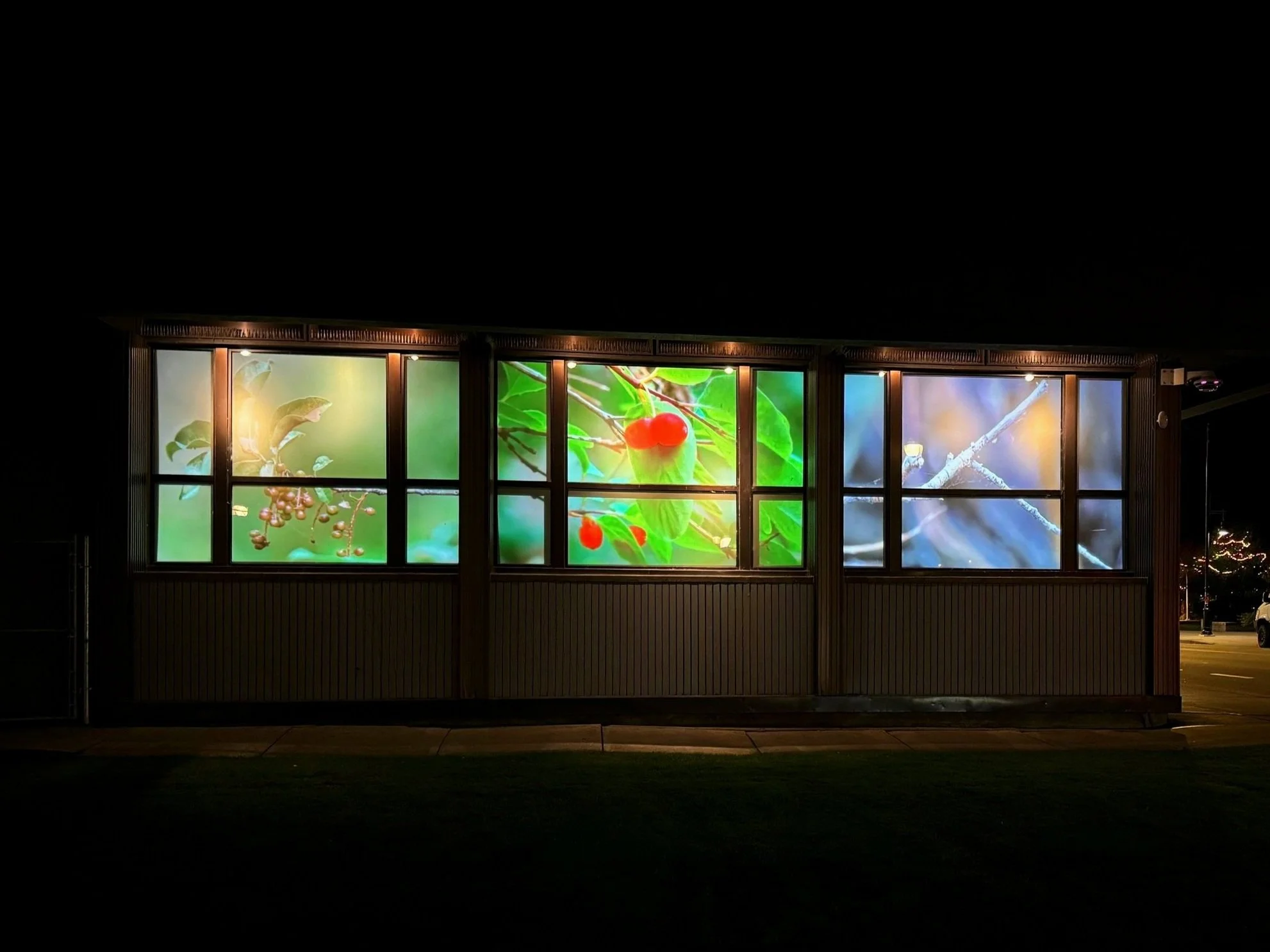 In response to the success of the salmon return to the Okanagan, École Okanagan Mission Secondary student Tara Dunn created the salmon imagery and symmetrical arrangement to mark this incredible initiative. Tara made this work as a math assignment for a tessellation project and a study of symmetry operations. Under the supervision of UBCO Associate Professor Aleksandra Dulic, this project was expanded to create variations across five Gobo lights.