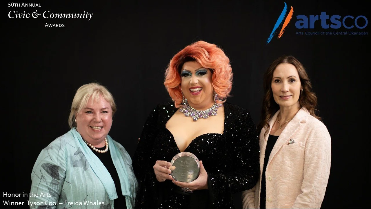 ARTSCO is proud to support the Honour in the Arts Award at the 50th Annual Civic & Community Awards, which recognizes individuals and organizations whose artistic contributions have made a lasting impact on the Central Okanagan. This year’s recipient is none other than Tyson Cook, widely known and loved as Freida Whales.